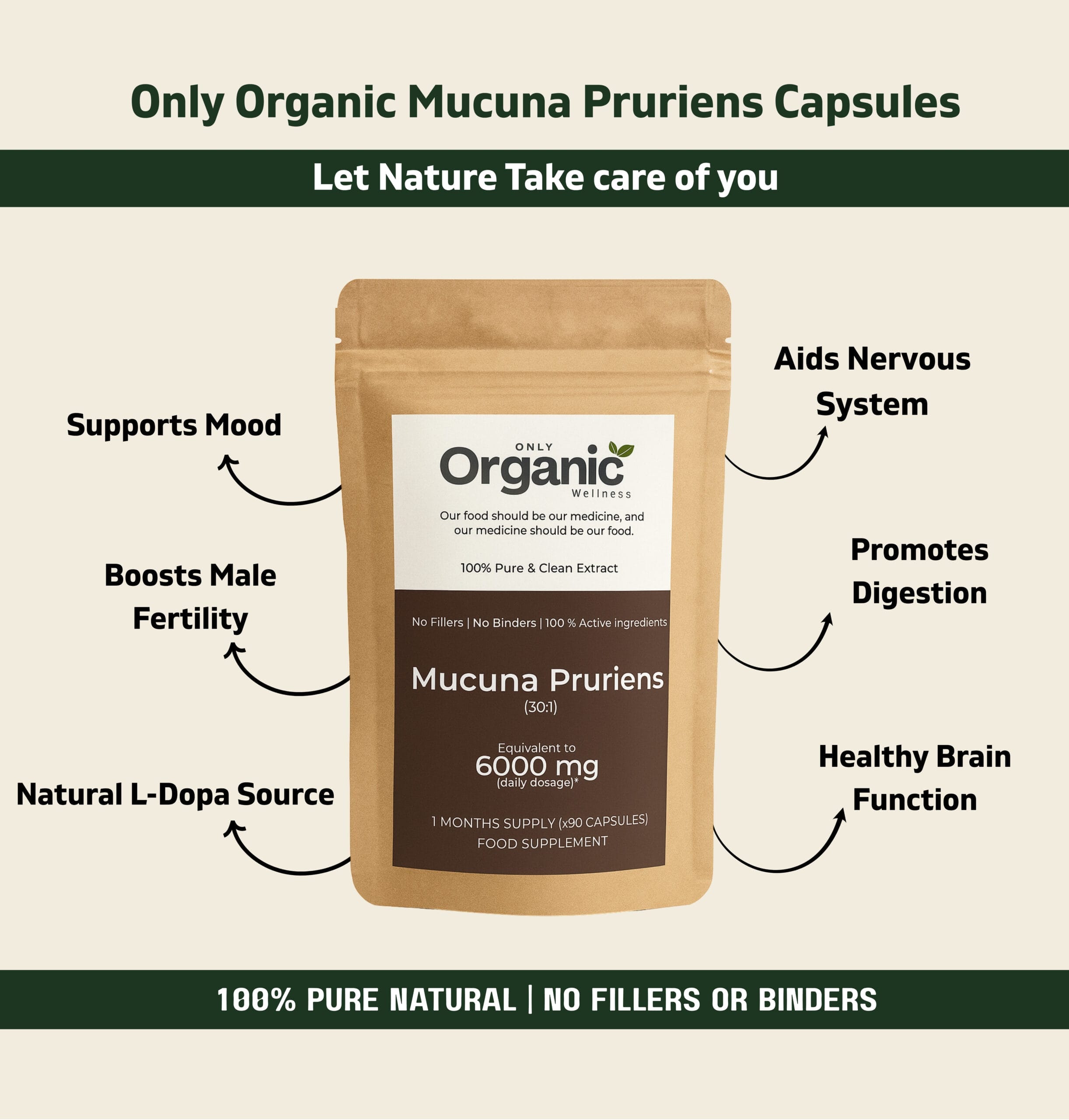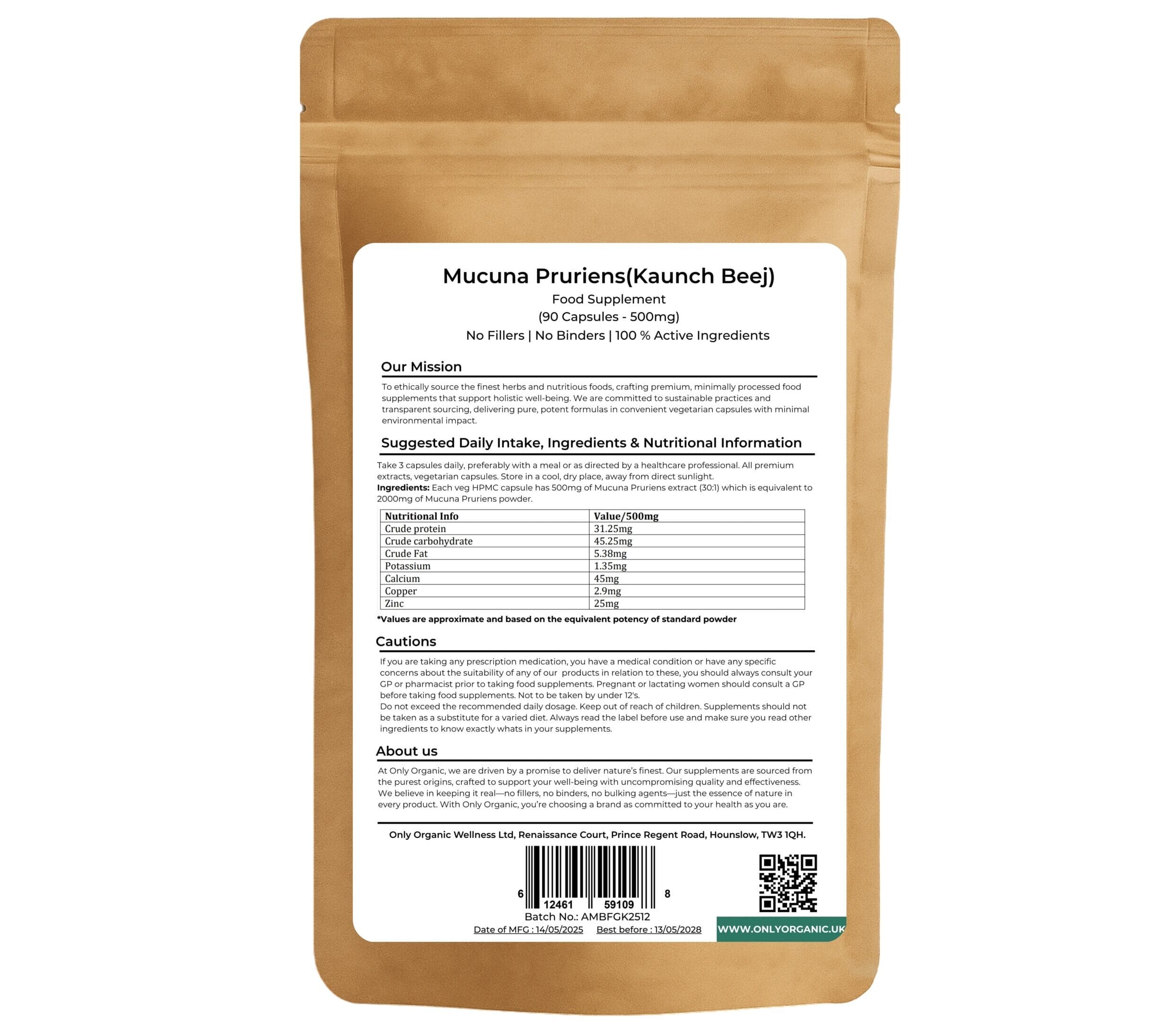 Experience the natural benefits of Only Organic Mucuna Pruriens Capsules, each containing 500mg of Mucuna Pruriens extract, equivalent to 6000mg of raw powder. Mucuna Pruriens, also known as velvet bean, is a tropical legume traditionally used in various wellness practices.