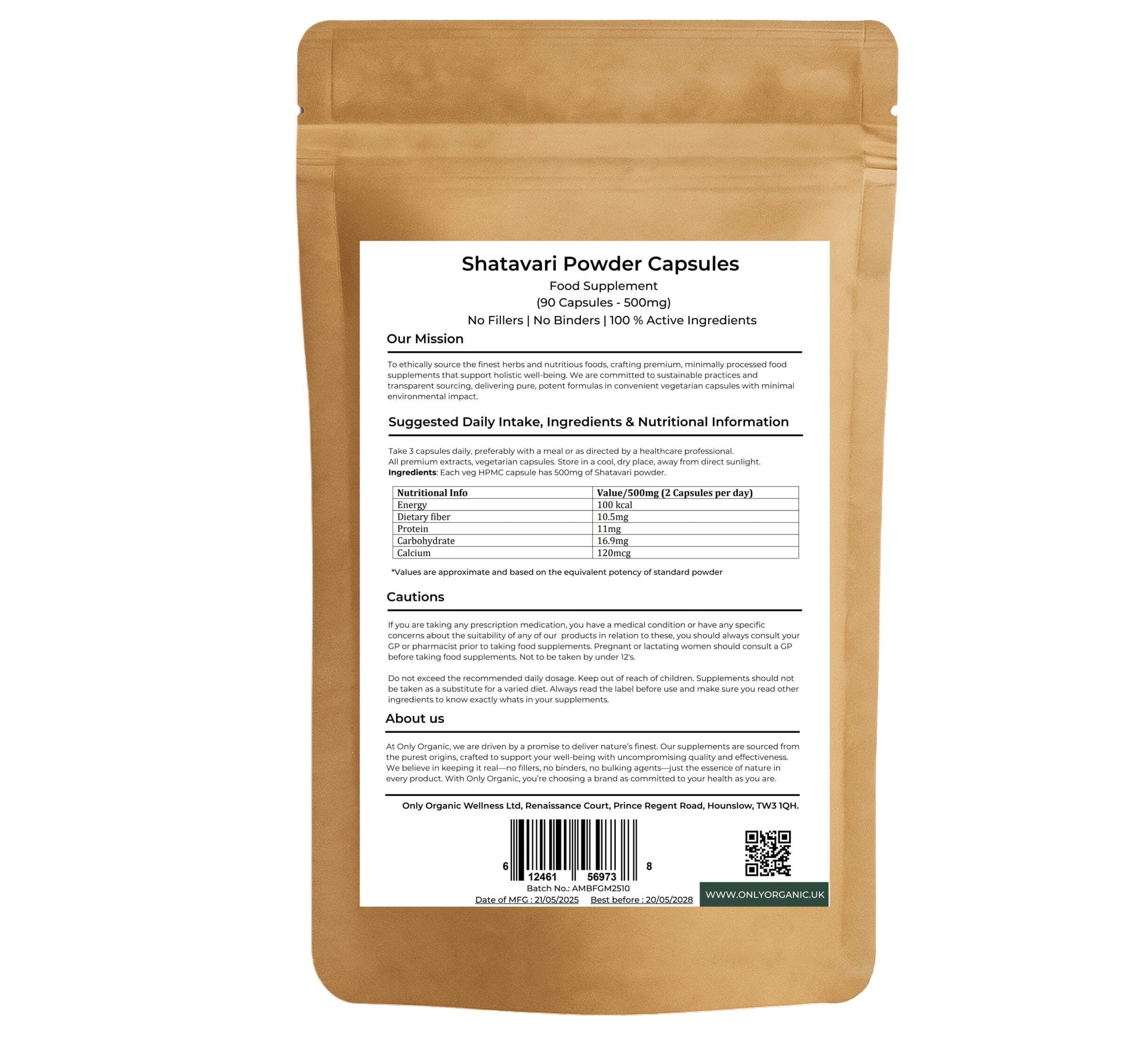Introducing Only Organic Shatavari Powder Capsules, each containing 500mg of pure Shatavari (Asparagus racemosus) root powder. Shatavari is traditionally valued in Ayurveda for its potential to support women’s health and overall vitality.